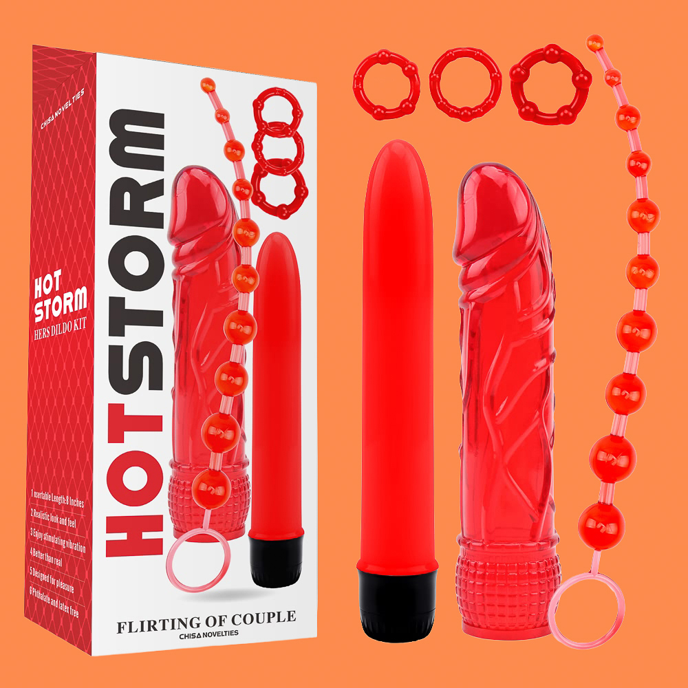 - Includes vibrating dildo, anal beads, and cock rings